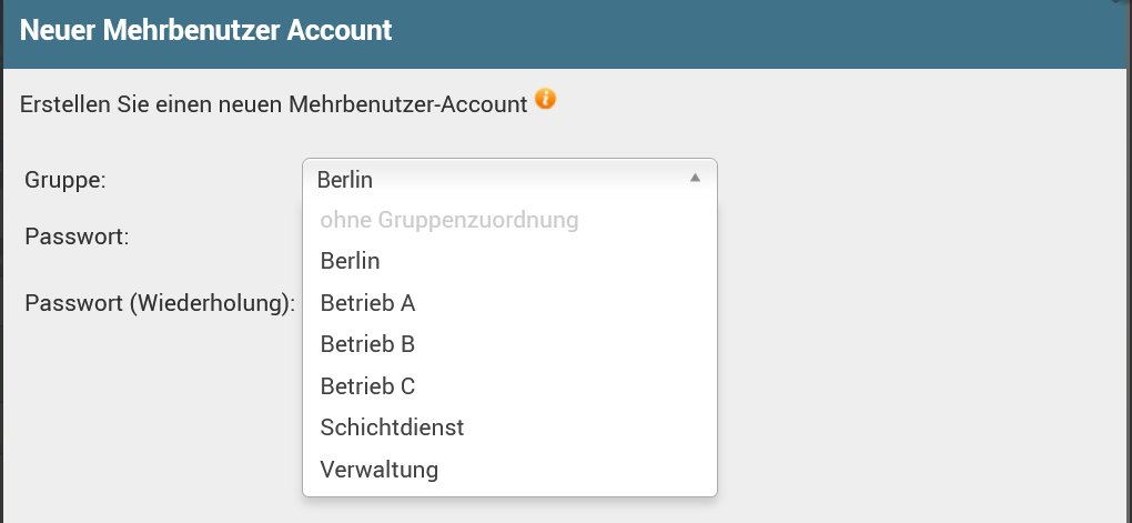 Es besteht nun auch die Möglichkeit, diese Accounts für Gruppen einzurichten. Dafür gehen Sie in der Web-Administration Module » Mehrbenutzermodus » Konfiguration auf das plus vor „neuer Mehrbenutzer-Account“. Mit den erstellten Daten loggen Sie sich an einem Gerät in die App ein und die Mitglieder dieser Gruppe können sich mit Ihrer Pin anmelden.
