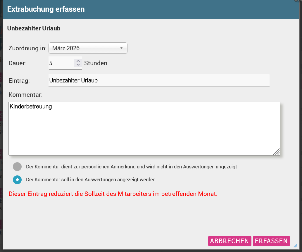 Bei den Sonderbuchungen (unbezahlter Urlaub, Überzeitkorrektur usw.) unter dem Reiter Mitarbeiter kann nun gewählt werden, ob der erfasste Kommentar in den Auswertungen angezeigt werden soll.
