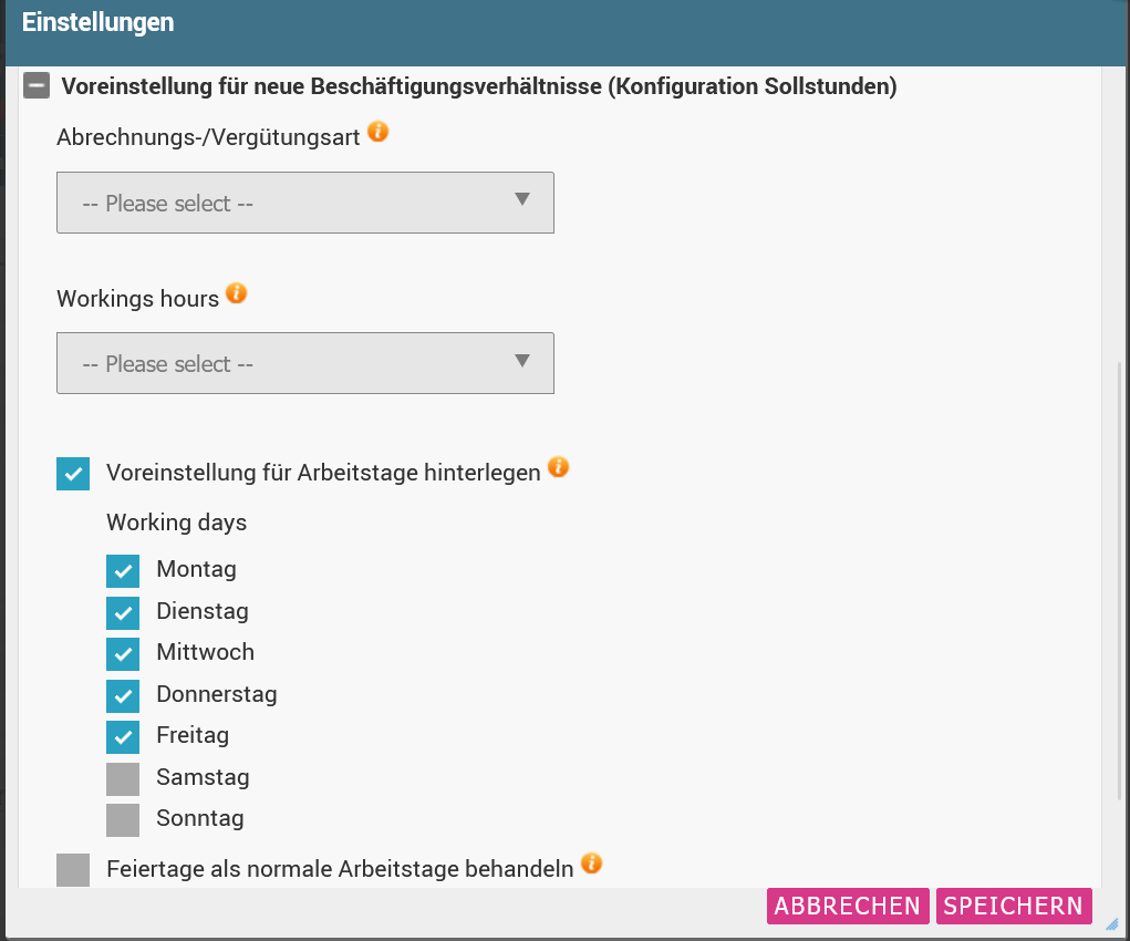 Bei neuen Arbeitsverhältnissen werden dann die voreingestellten Werte übernommen.